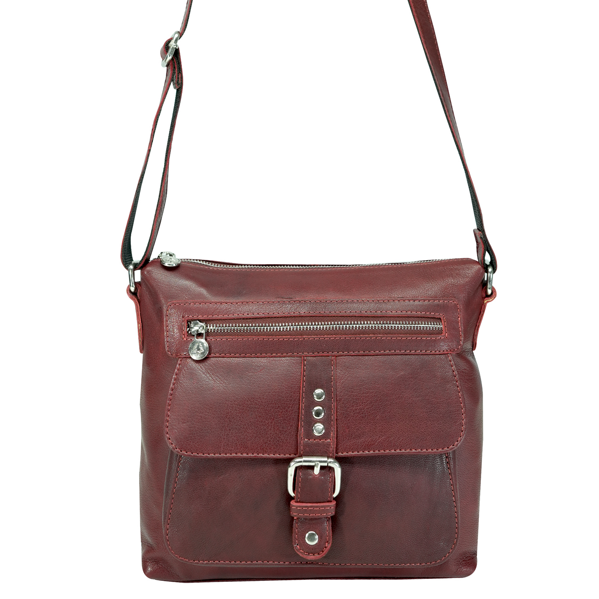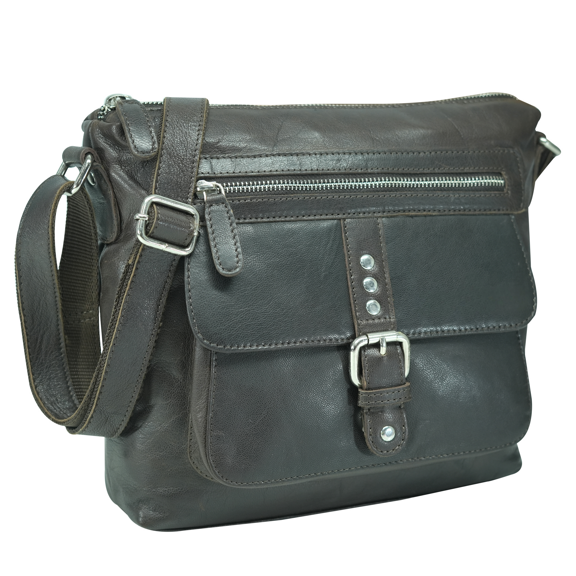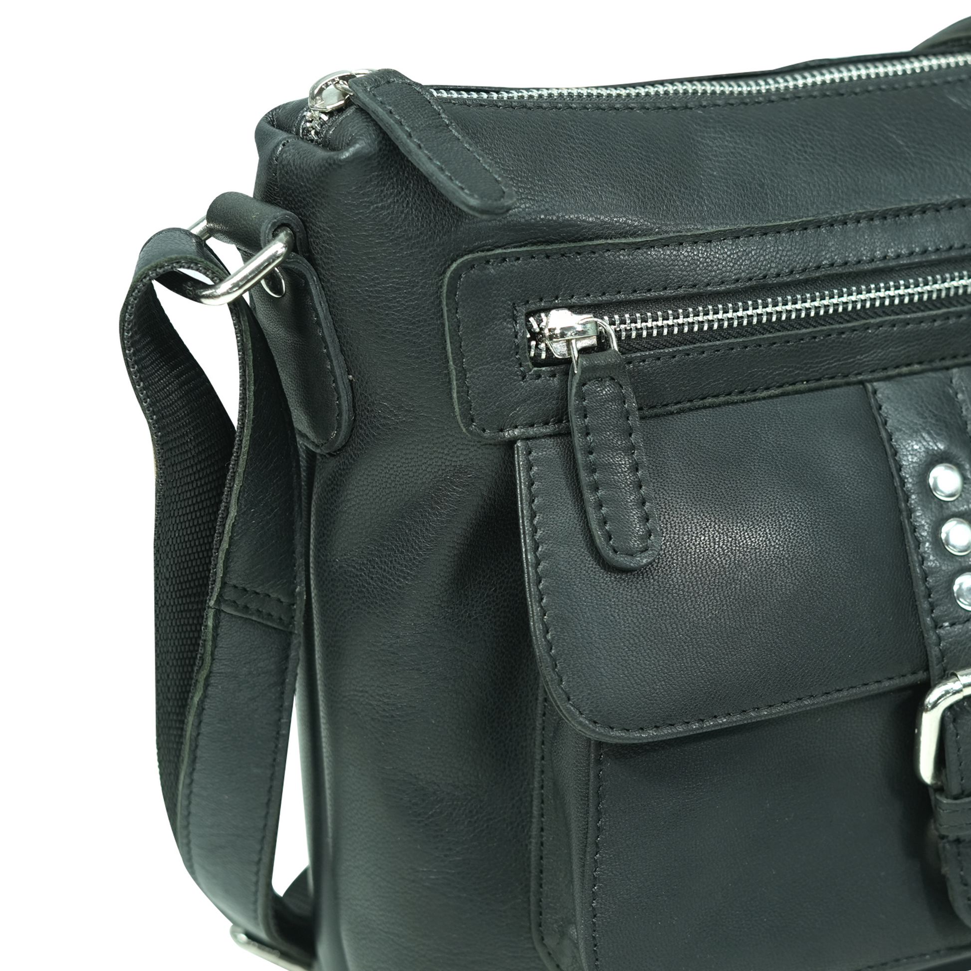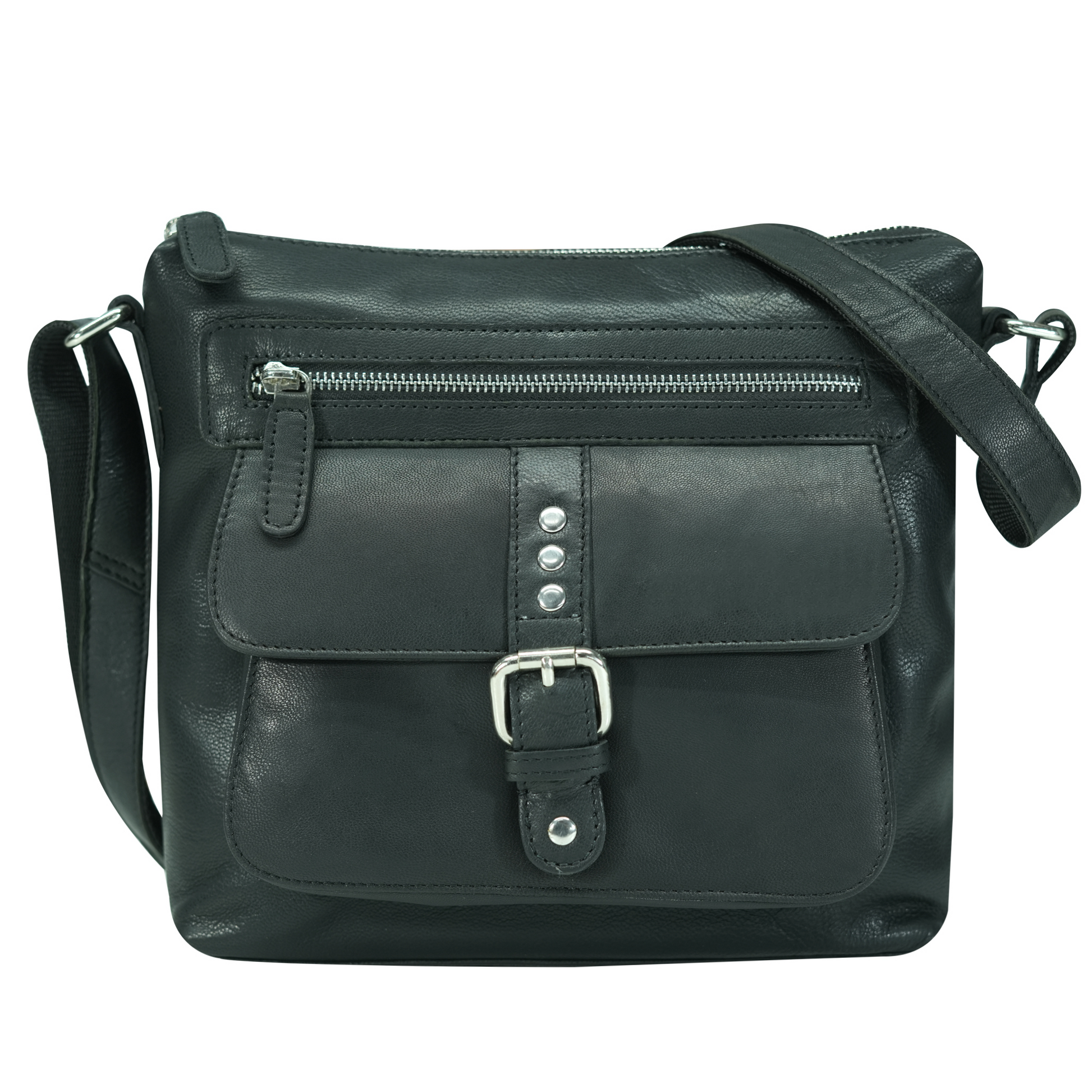 - Front flap pocket with buckle and stud closure
