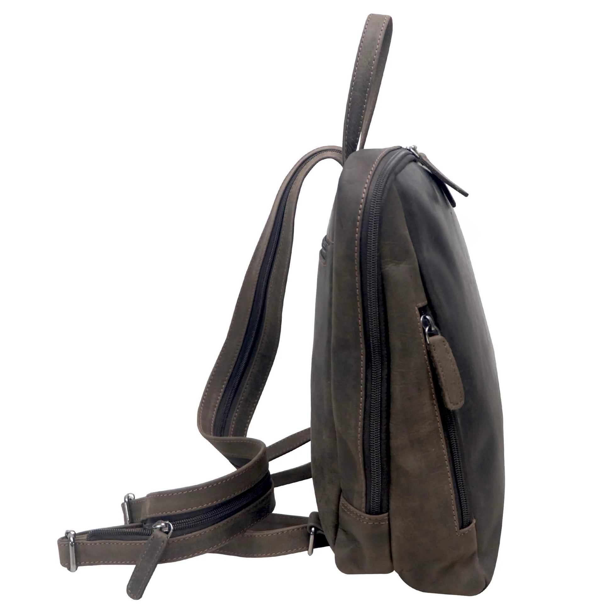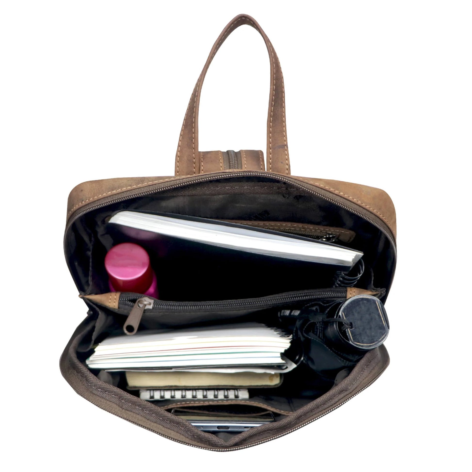 The casual look of the leather and the small size make it the ideal everyday companion. The large main compartment easily accommodates a smartphone, wallet, water bottle and tablet. You can carry valuable items with you protected and close to your body - a zippered back compartment ensures this. The outer compartments are suitable for small items. Thanks to the integrated zipper in the shoulder strap, you have different carrying options: classic backpack or cross-body bag.