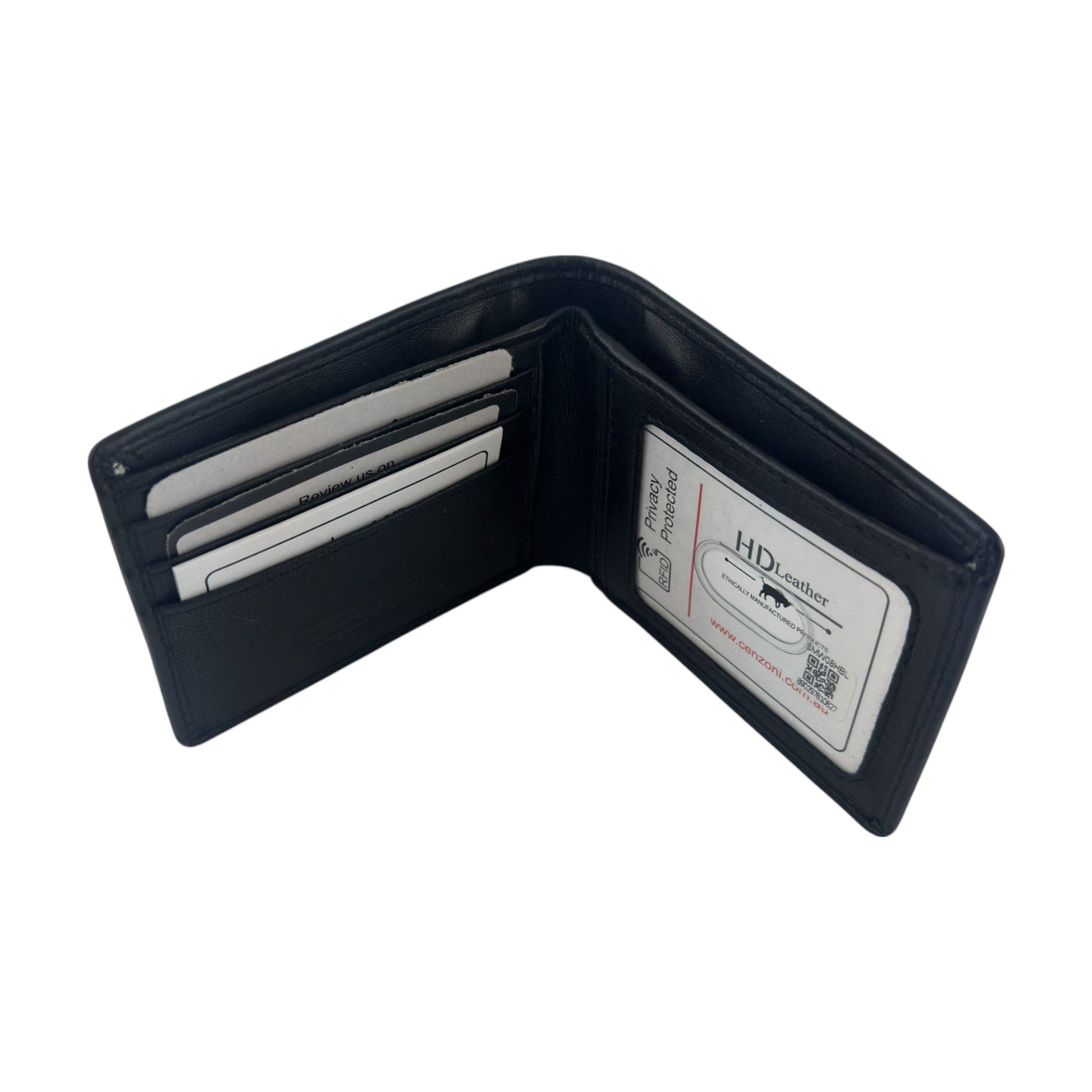 Crafted from sheepskin, this men's wallet includes a discreet note compartment, three slots for cards, and a window slot for your ID. It offers two slip pockets ideal for receipts, folded bills, or notes, plus an open note section and a hidden compartment under a leather flap. With built-in RFID protection for your peace of mind, the wallet measures 8.5 cm tall by 11 cm wide.