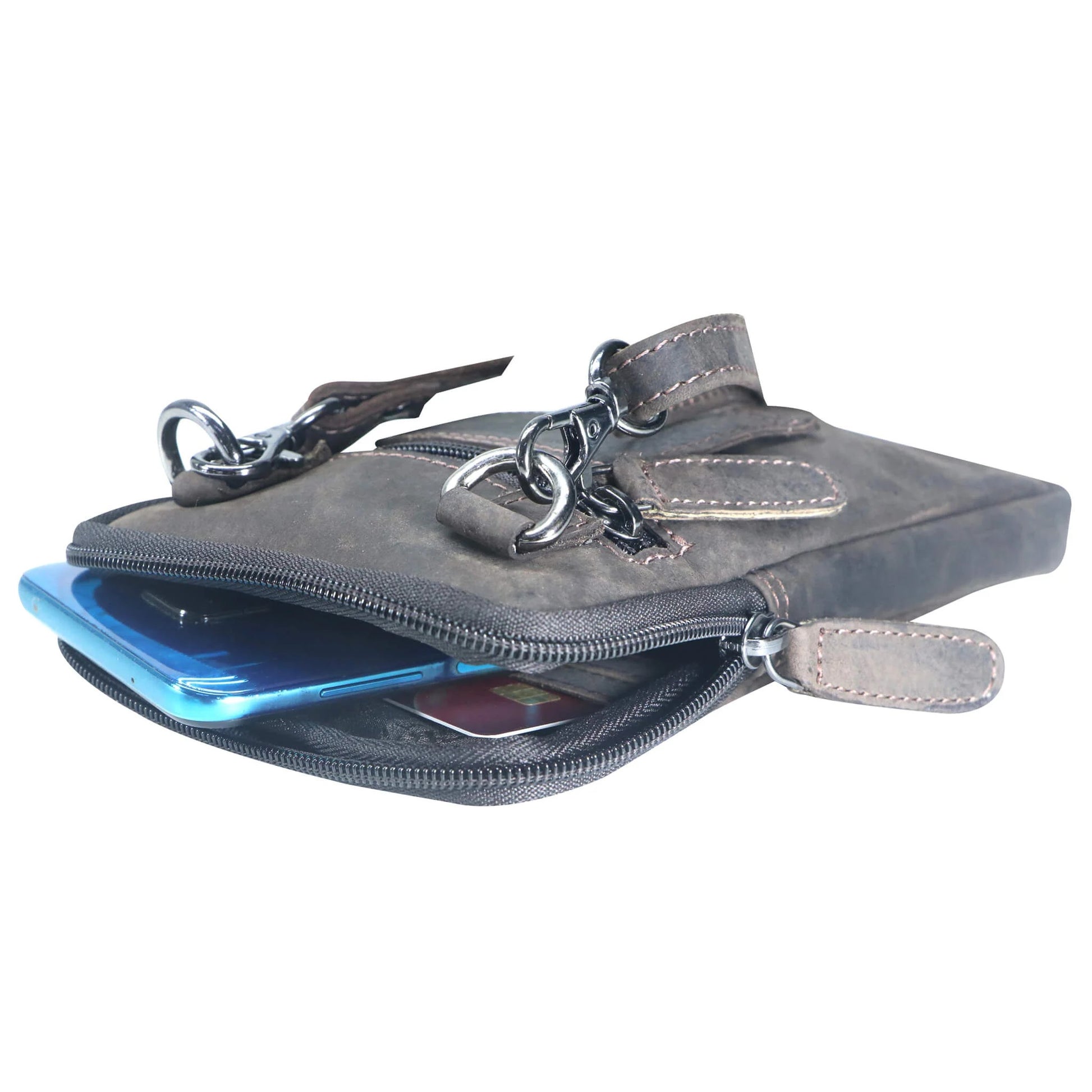 The Oli leather smartphone shoulder bag is ideal for people who prefer a modern and elegant design. It features a zippered main compartment with 5 card slots, a back zippered pocket for small items, and a belt loop on the back for belts up to 5 cm wide. This great mobile phone case for men and women is also very flexible - it adapts to all current smartphones and still offers space for small wallets. The design is rounded off with the detachable and length-adjustable full leather shoulder strap (up to 150 cm long).
